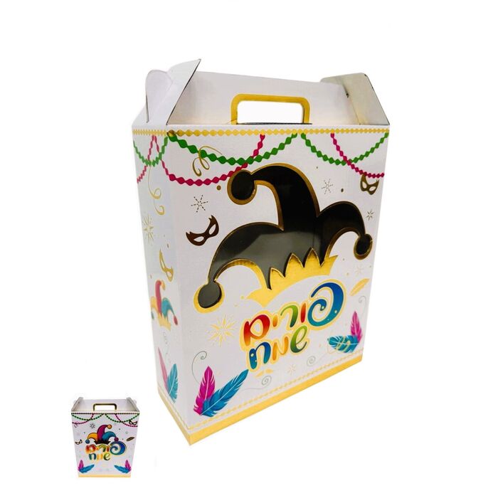 קופסא למשלוח מנות עם חלון כובע ליצן פורים שמח 30*25*9 ס״מ דגם 24013